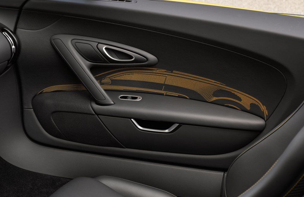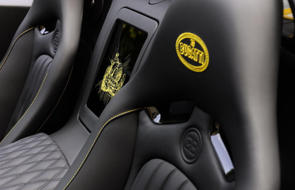 Enfin, autres détails, un énorme logo Bugatti noir a été flanqué sous l’aileron arrière et les initiales « PL » du client en finition anodisée – nécessitant 200 heures de travail – forment la grille de calandre. Dans le cockpit de la « One of One », quelques surpiqûres jaunes, un dessin de la Type 35 entre les sièges et le logo sur les appuie-têtes contrastent avec le noir omniprésent des cuir et fibre de carbone, tandis qu’un procédé au laser fait apparaître la silhouette de la Veyron sur les contreportes.