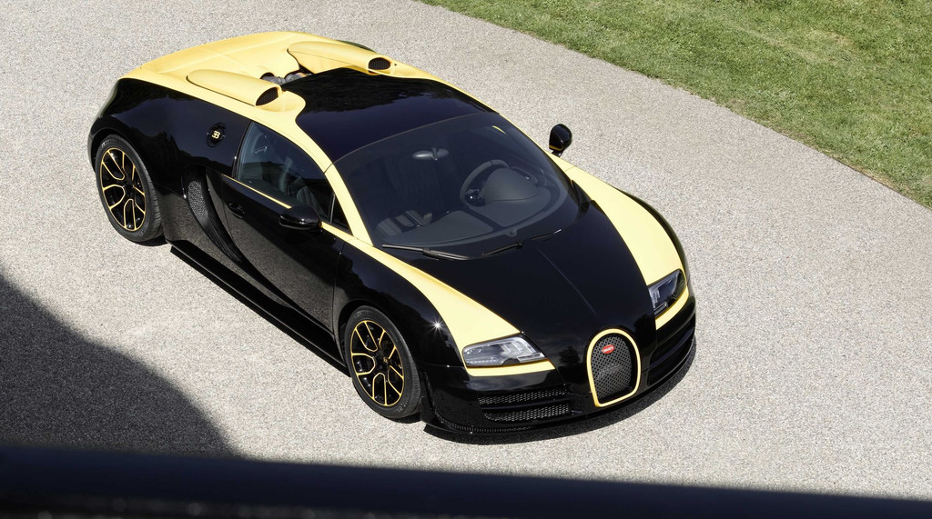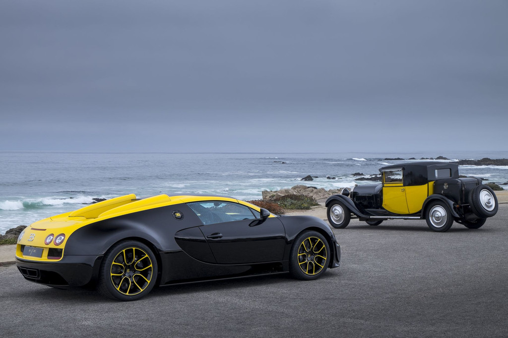 Cette Veyron reprend la carrosserie bi-ton noire et jaune employée par les ancêtres Type 41 Royale, Type 55 ou la Type 44 visible sur certains clichés. L’essentiel de l’extérieur est donc noir, le jaune clair recouvrant le contour de calandre, l’entourage des optiques, la découpe supérieure de pavillon, les contours de jantes, le capot, l’aileron et la partie supérieure arrière.